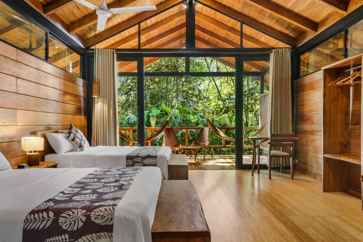 Mittelgrosse Lodge mit Zimmern in strohbedeckten Bungalows, alle mit Deckenventilator und privater Terrasse mit Hängematten. Hauptrestaurant sowie Bar mit Aussichtsterrasse im rustikalen Hauptgebäude, Lounge an der Lagune mit Swimmingpool (von einem Netz umschlossen), Schmetterlingsfarm, 300 m langes Hängebrückensystem, 43 m hoher Aussichtsturm.
